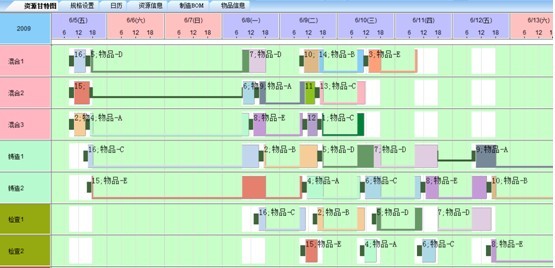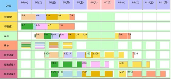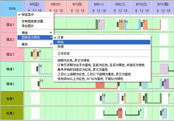 甘特图上工作的颜色,不仅可以在订单上定义,也可在物品、资源上定义,或者根据其他属性定义,如工作状态、交货期、优先级等。