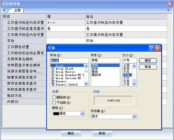 4)工作标签显示字体的大小、字形、颜色都可以指定,在弹出的“甘特图参数”对话框中,单击“字体”值,弹出“字体”对话框,如下图:
