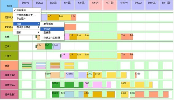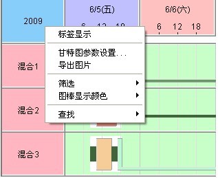 在资源甘特图上(或订单甘特图上),在日期栏与资源栏相交处(或日期栏与订单栏相交处)的单元格,右键单击,在弹出的右键功能菜单中选择“图棒显示颜色”,在其下一级子菜单中,可根据需要选择“订单”、“物品”、“资源”及其他选项,如下图: